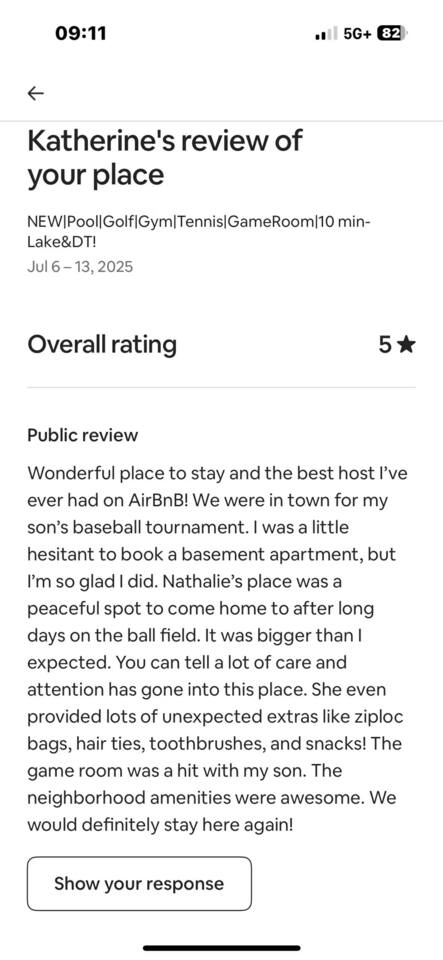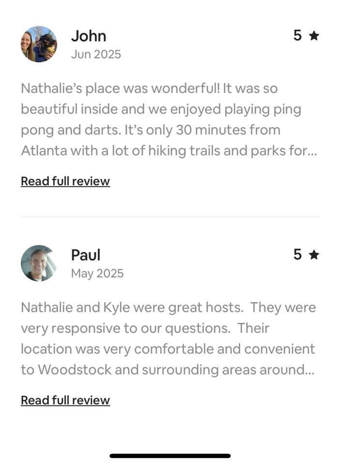 The Space Experience a relaxing escape in this beautifully updated 1-bedroom, 1-bath guesthouse, perfectly suited for up to 4 guests (recommended for 3 adults or 2 adults with 2 children). Enjoy a fun-filled game room, cook meals in the fully stocked kitchen, and savor evenings on the patio with a BBQ grill and firepit. In the fall, the area around Lake Allatoona and Red Top Mountain State Park bursts with color—shades of red, orange, and gold that peak from late October into early November. Trails and scenic drives are just minutes away, making it an ideal year-round retreat. 🔥 Resort Amenities & Local Adventures 🔥 Enjoy exclusive access to community pools (seasonal), tennis courts, fitness center, and golf course, or explore Woodstock’s vibrant breweries, live music, and lakeside dining nearby. Key Features: ❂ Sleeps 4 (ideal for up to 3 adults or 2 adults + 2 children) ❂ 1 Bedroom with queen bed & luxury linens ❂ 1 Full bathroom ❂ Sleeper sofa in living room ❂ Game room with ping pong, darts & classic board games ❂ Smart TV with Netflix & Amazon Prime ❂ Fully equipped kitchen with black stainless steel appliances ❂ Private patio with seating, firepit & BBQ grill ❂ Access to two pools, gym, golf, tennis, and playgrounds ❂ Free Wi-Fi, keyless entry, & complimentary toiletries ❂ Pet-friendly (small nightly fee applies) Guest Reviews (Short Highlights) ❂ “Perfect location for visiting family… so much better than a hotel room!” – Patrick, NC ❂ “Incredibly clean, cozy, and comfortable. Thoughtful touches made our honeymoon special.” – Widnael, GA Nearby Attractions: ❂ Downtown Woodstock – breweries, live music, shopping & dining ❂ Lake Allatoona – boating, fishing & swimming ❂ Red Top Mountain – hiking, scenic overlooks & fall colors ❂ Local golf, tennis, and resort-style amenities AGREEMENT ❂ A signed rental agreement is required after booking. Please reach out anytime with questions or requests—we’re happy to make your stay seamless.